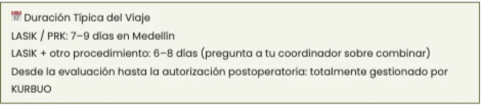 • Día 2: Cirugía LASIK. El procedimiento toma 10–15 minutos por ojo. Descansas en el hotel después.