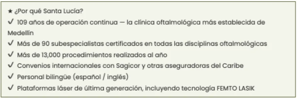 Santa Lucía no es una clínica de turismo médico improvisada. Es un centro de oftalmología subespecializado de servicio completo que atiende pacientes colombianos, caribeños, y un número creciente de pacientes norteamericanos y europeos cada año.
